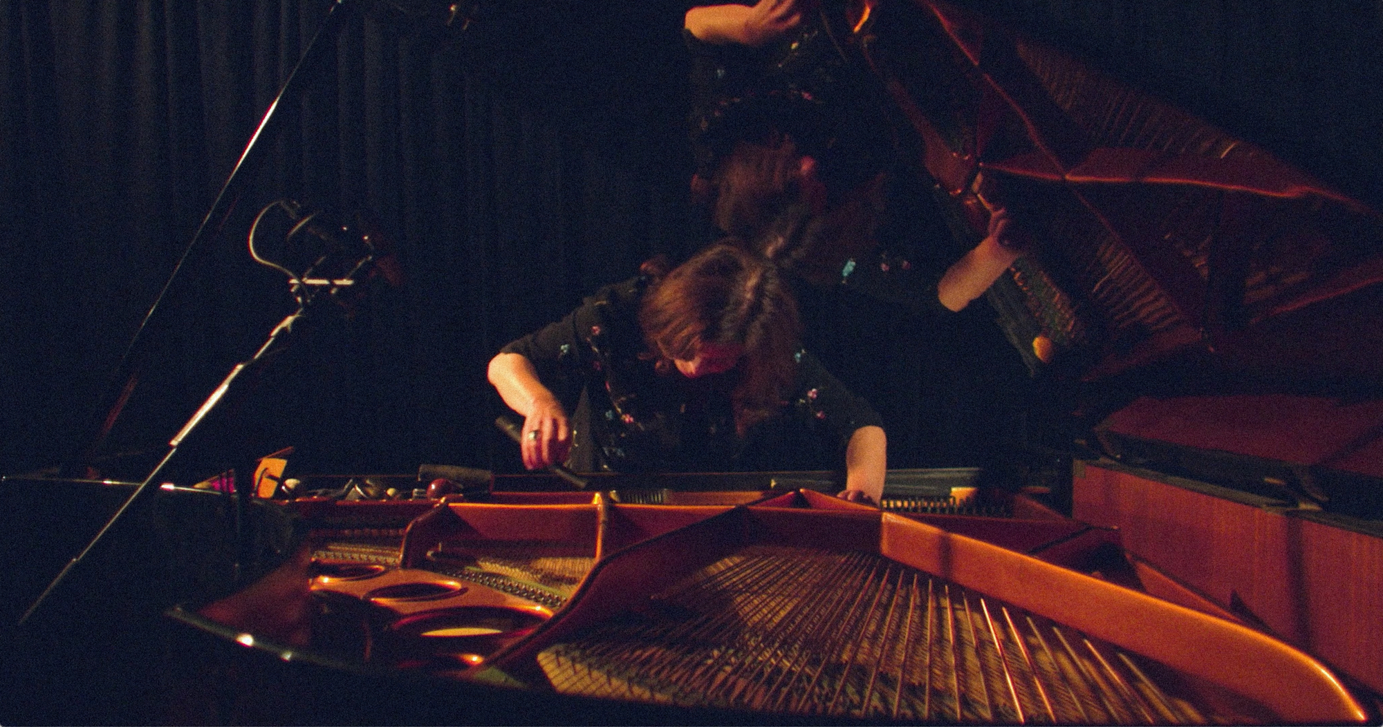 In the opening of Sam Williams's film, No End, I see red boots against black curtain, a woman sits down, stands up, reaches over the keys and into the body of the piano.